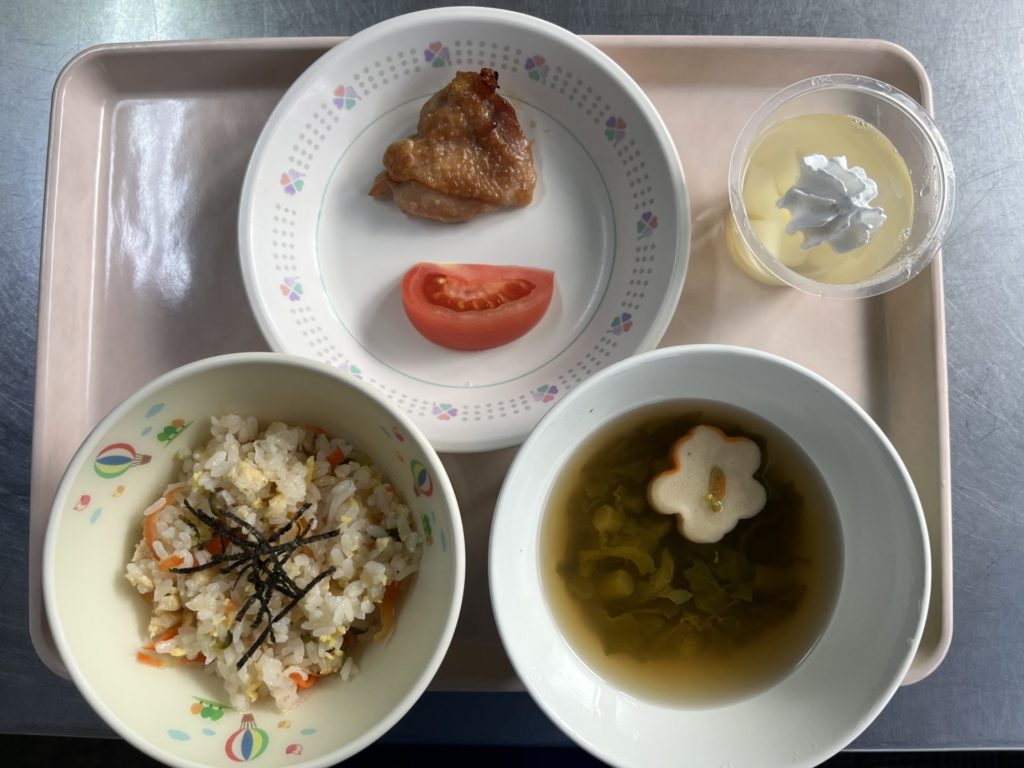 今日のお給食は、ちらし寿司、てりやきチキン、トマト、すまし汁でした。