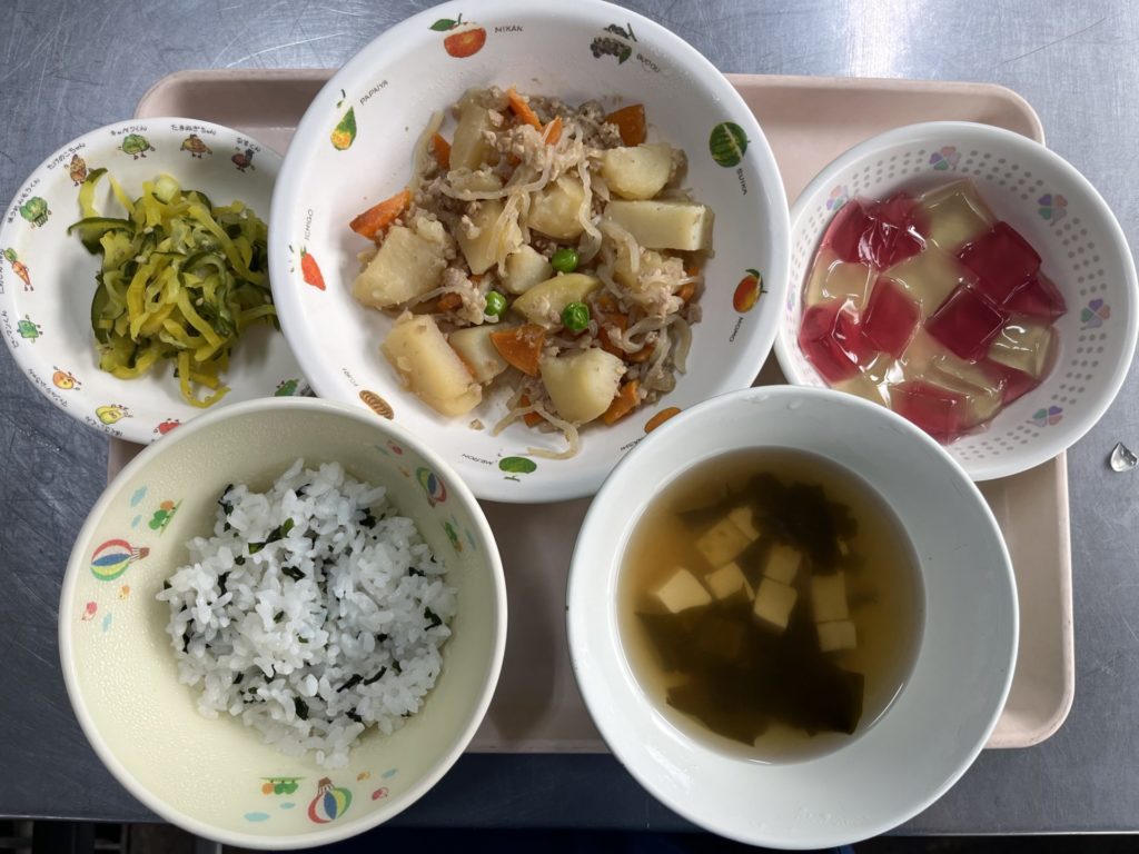 今日のお給食は、肉じゃが、キュウリとたくあんの和えもの、菜めし、すまし汁でした。