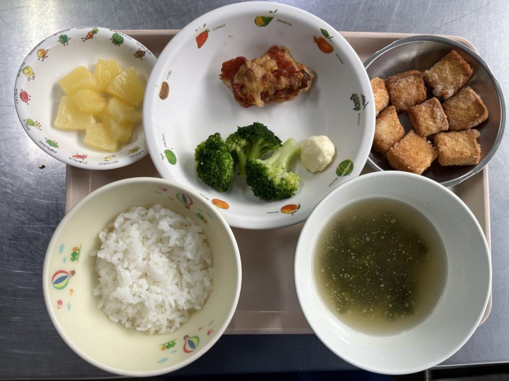 今日のお給食は、ピザ風チキン、ブロッコリー、ごはん、野菜スープ、パイン缶でした。