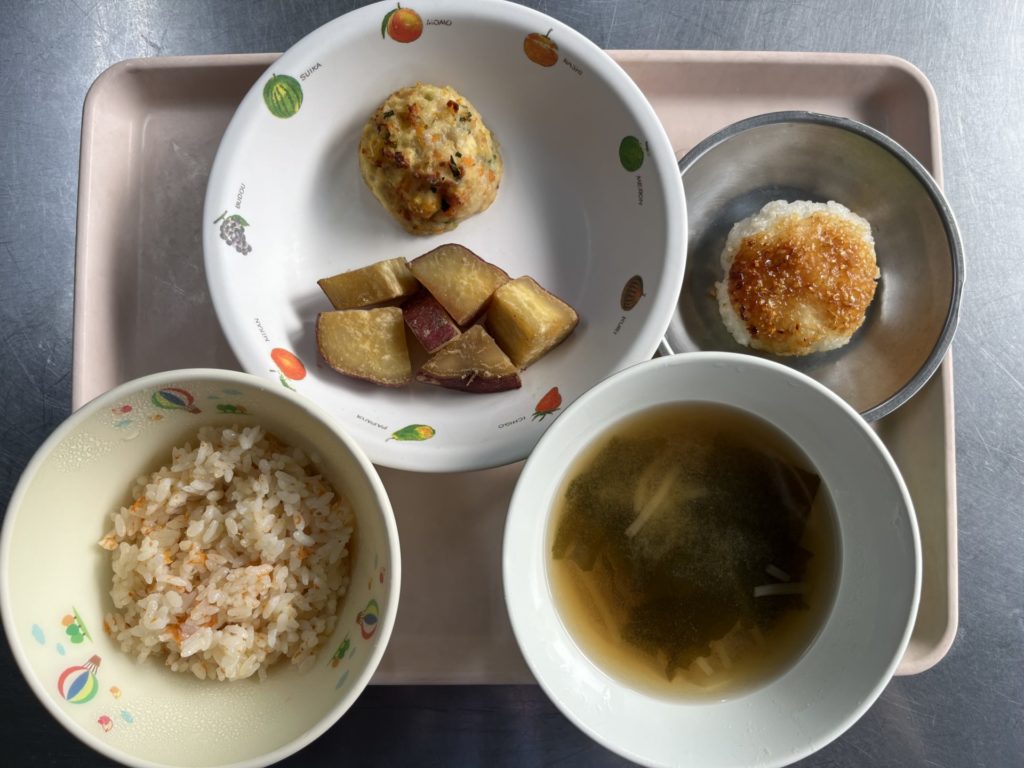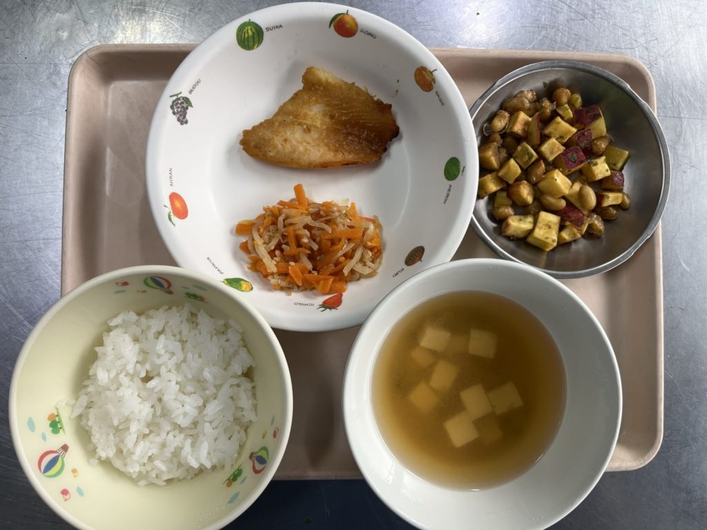 今日のお給食は、豆腐のふんわりあげ、さつまいもの甘煮、夕焼けごはん、おみそ汁でした。