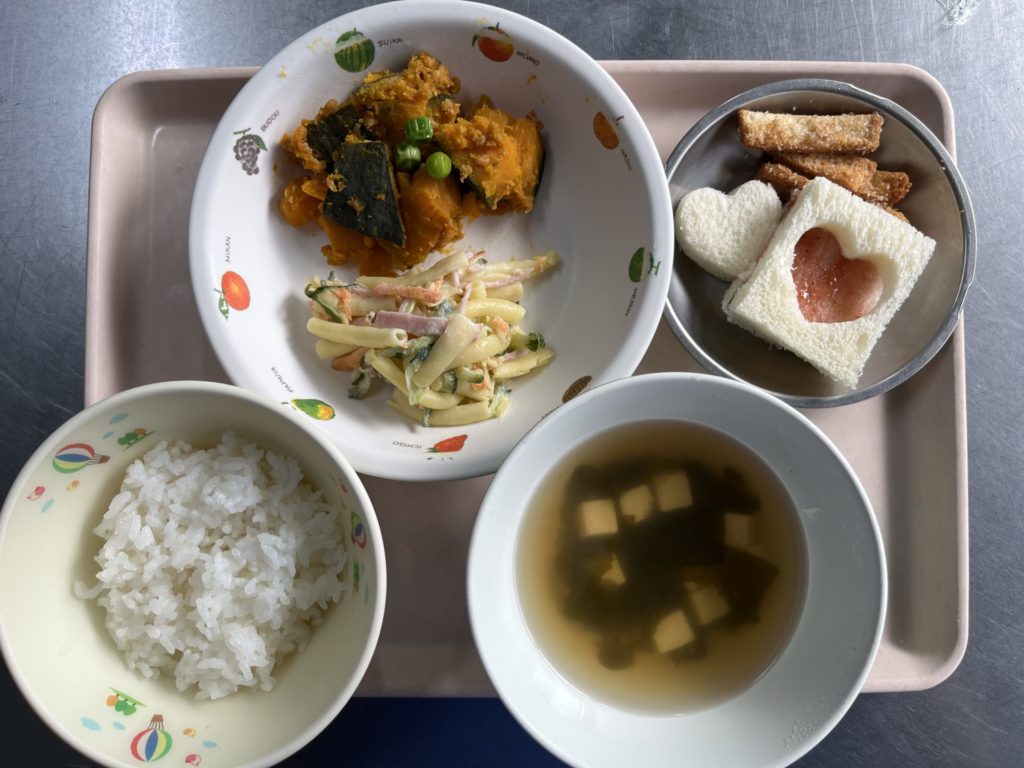 今日のお給食は、かぼちゃのそぼろあんかけ、マカロニサラダ、ごはん、すまし汁でした。