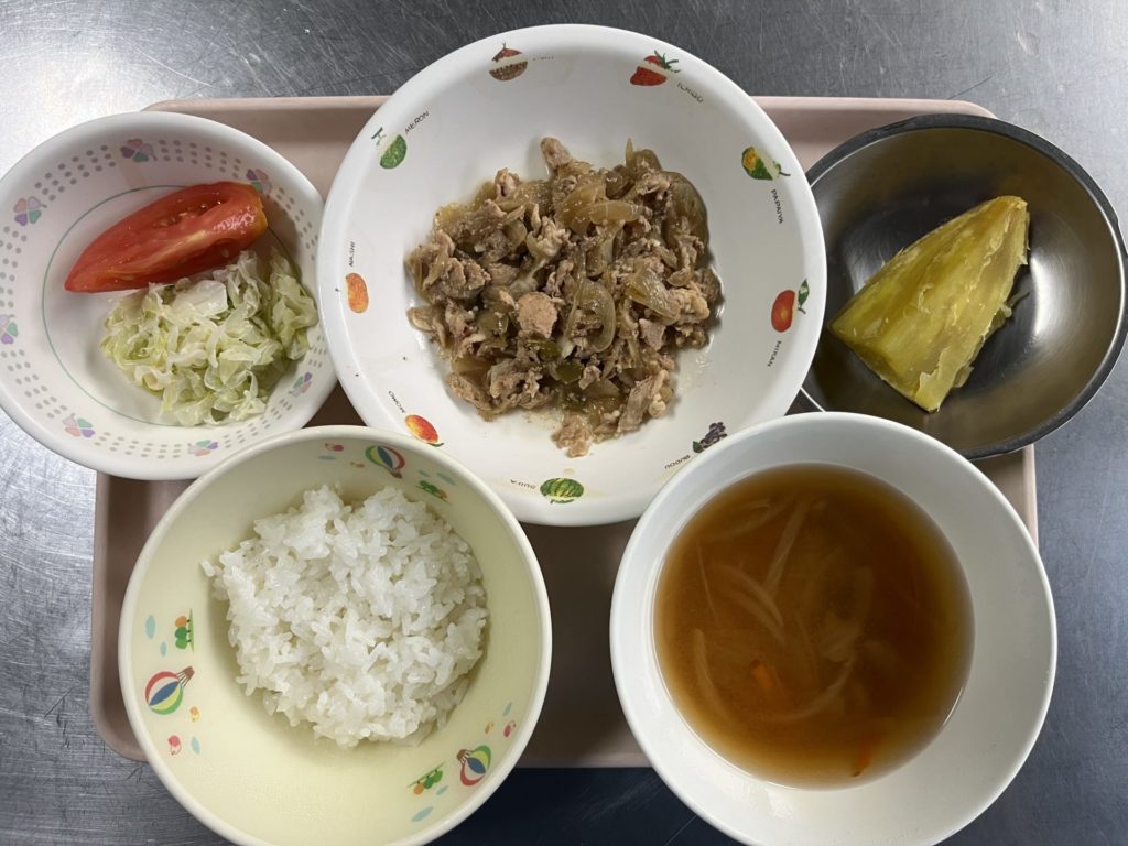 今日のお給食は、豚肉の生姜焼き、キャベツ、トマト、ごはん、おみそ汁でした。
