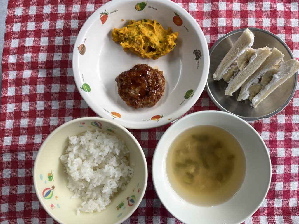 今日のお給食は、ハンバーグ、かぼちゃサラダ、ごはん、おみそ汁でした。