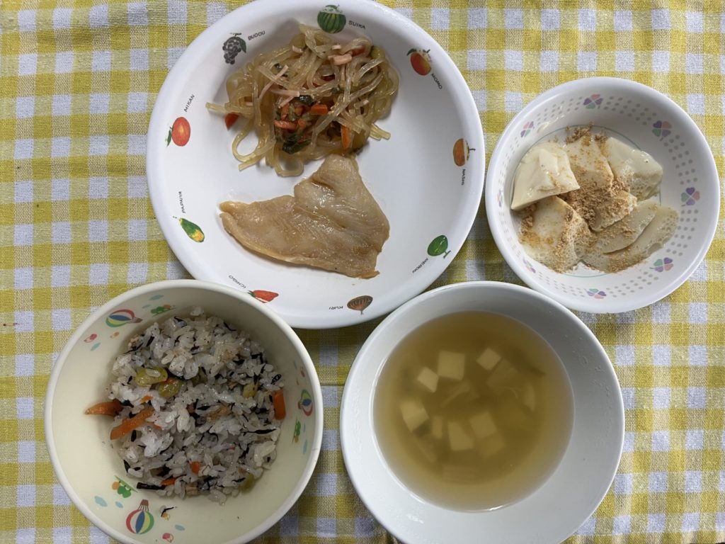 今日のお給食は、白身魚の煮つけ、はるさめサラダ、ひじきご飯、おみそ汁でした。