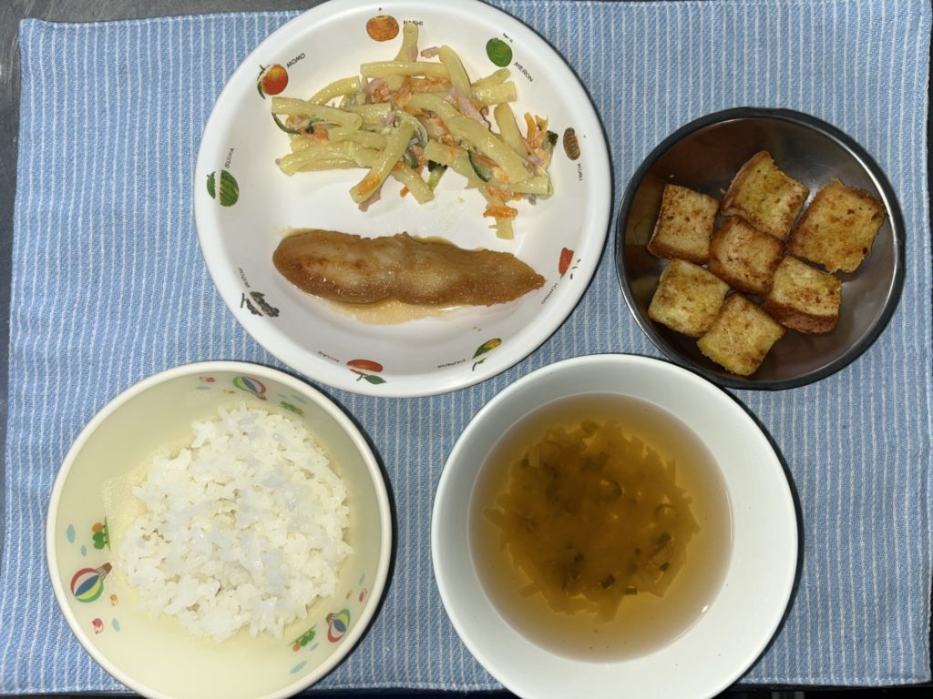 今日のお給食は、魚のみそ煮、マカロニサラダ、ごはん、すまし汁でした。