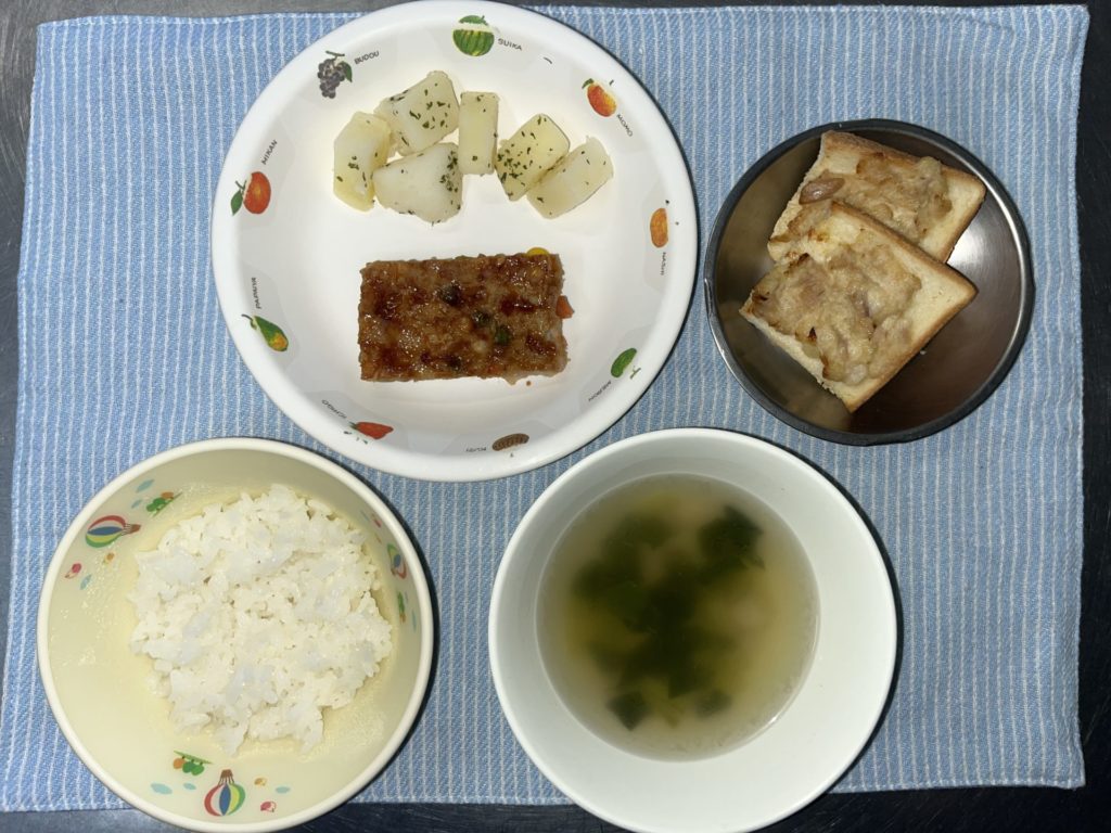 今日のお給食は、ミートローフ、粉ふきいも、ごはん、コンソメスープでした。