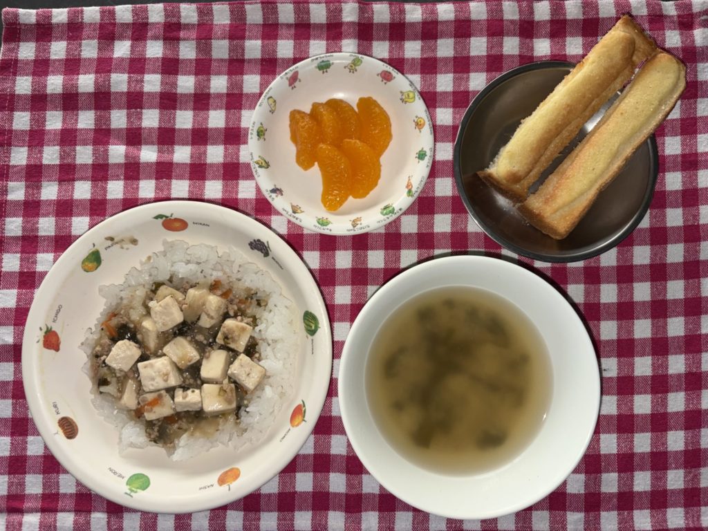 今日のお給食は、豆腐のあんかけ丼、おみそ汁、みかん缶でした。