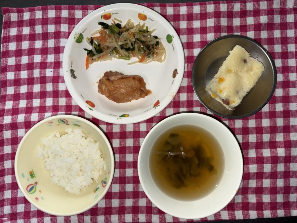 おやつは、ウインナーコーン蒸しパン、牛乳です。