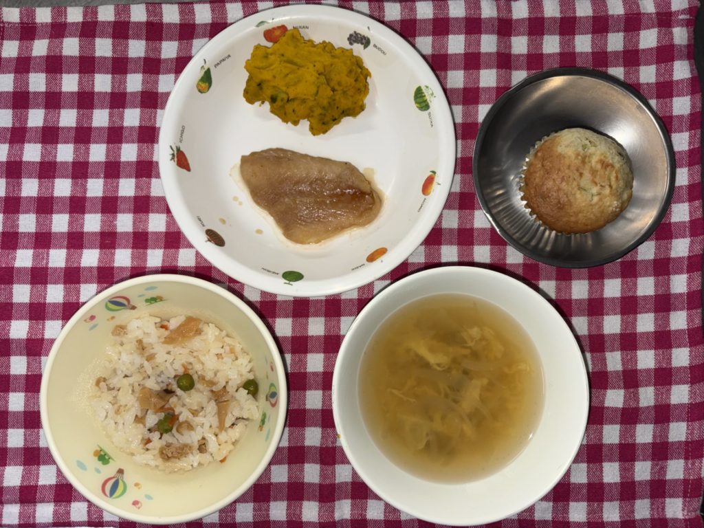 今日のお給食は、煮魚、かぼちゃサラダ、五目ごはん、かきたま汁でした。