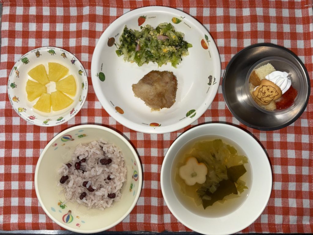 お昼は、鶏のから揚げ、ミモザサラダ、お赤飯、すまし汁、パイン缶でした。