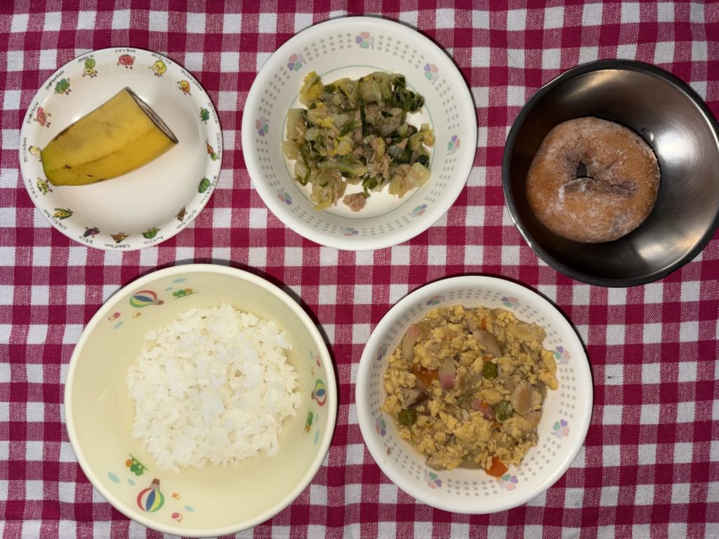 おやつは、豆乳ドーナツ、牛乳です。