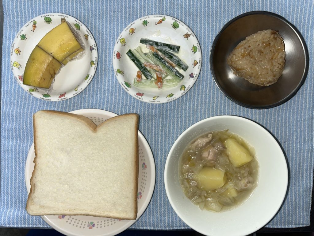 今日のお給食は、ピザ風チキン、キャベツサラダ、ごはん、ポテトスープでした。