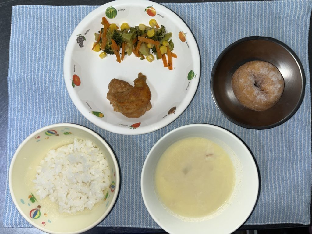 今日のお給食は、タンドリーチキン、ブロッコリーのサラダ、ごはん、かぼちゃのミルクスープでした。