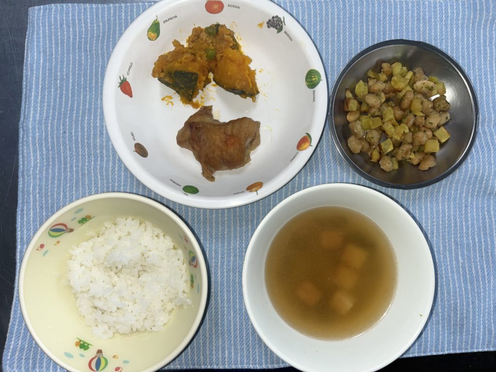 今日のお給食は、鶏肉のカレー焼き、かぼちゃのそぼろあんかけ、ごはん、おみそ汁でした。