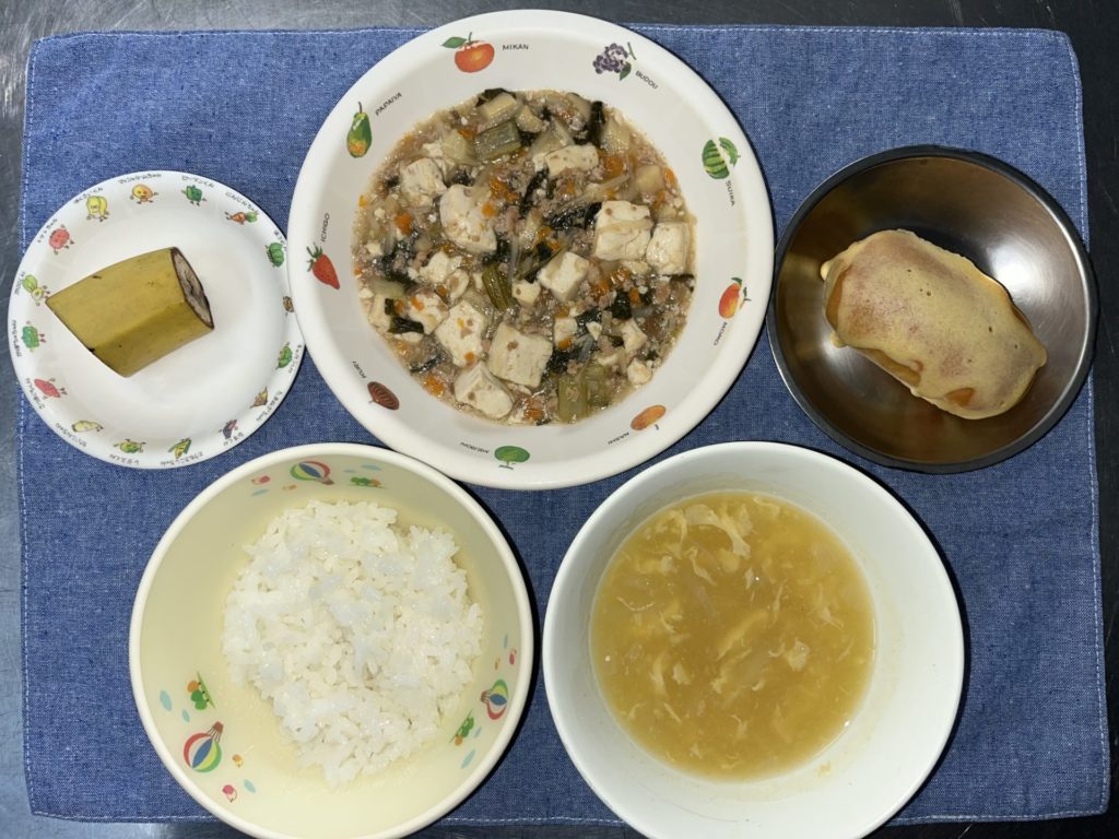 今日のお給食は、豆腐の中華煮、中華コーンスープ、ごはん、バナナでした。