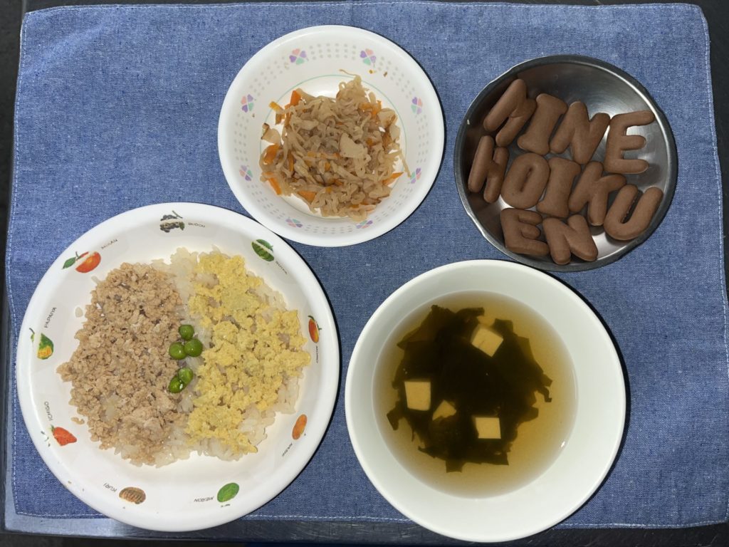 今日のお給食は、切り干し大根の煮物、三食丼、すまし汁でした。
