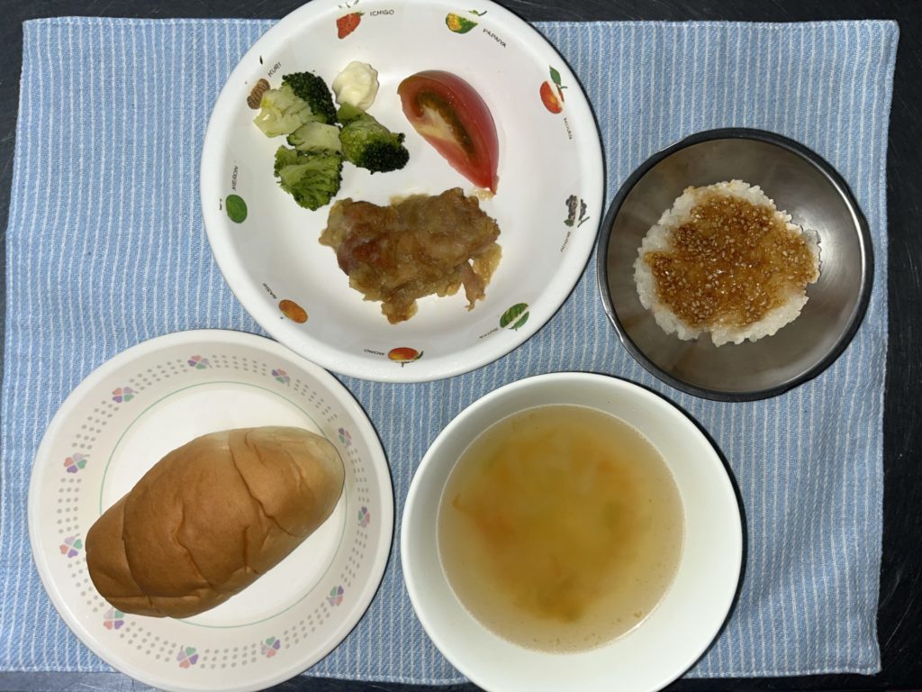 今日のお給食は、フライドチキン、ブロッコリー&トマト、パン、野菜スープでした。