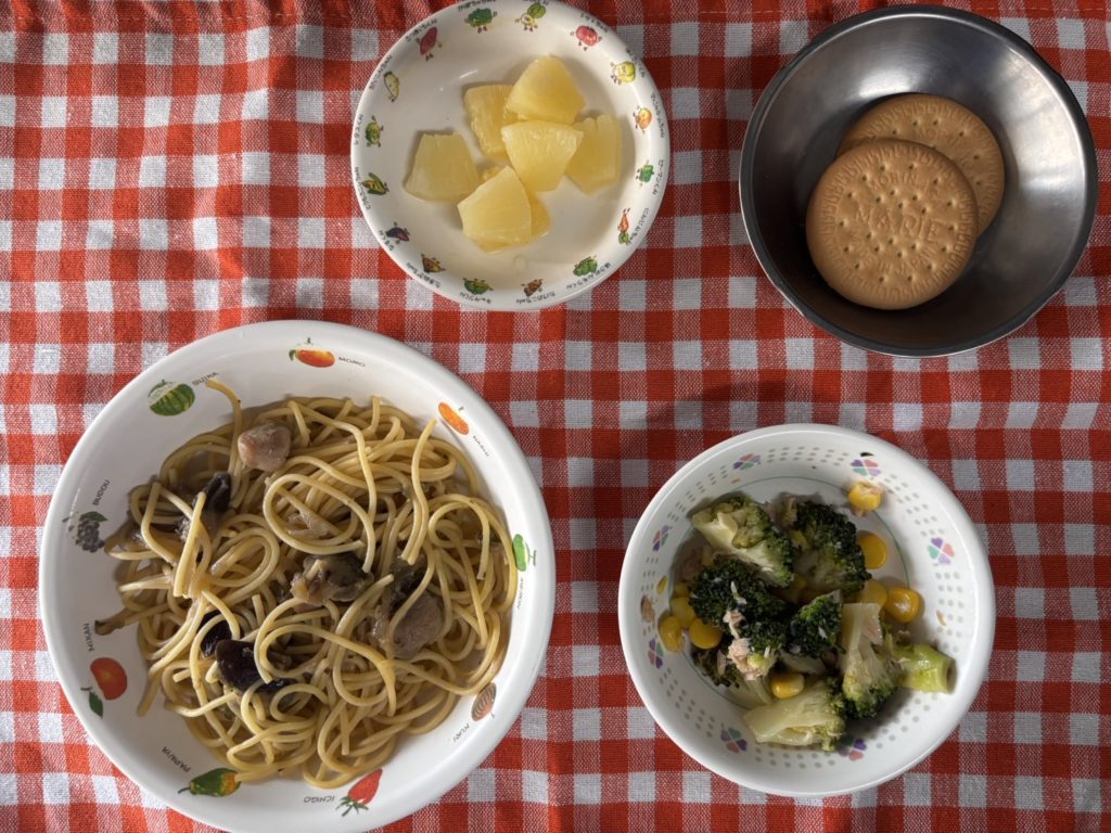 今日のお給食は、夏野菜のバター醤油スパゲティー、ブロッコリーとツナのサラダ、パイン缶でした。