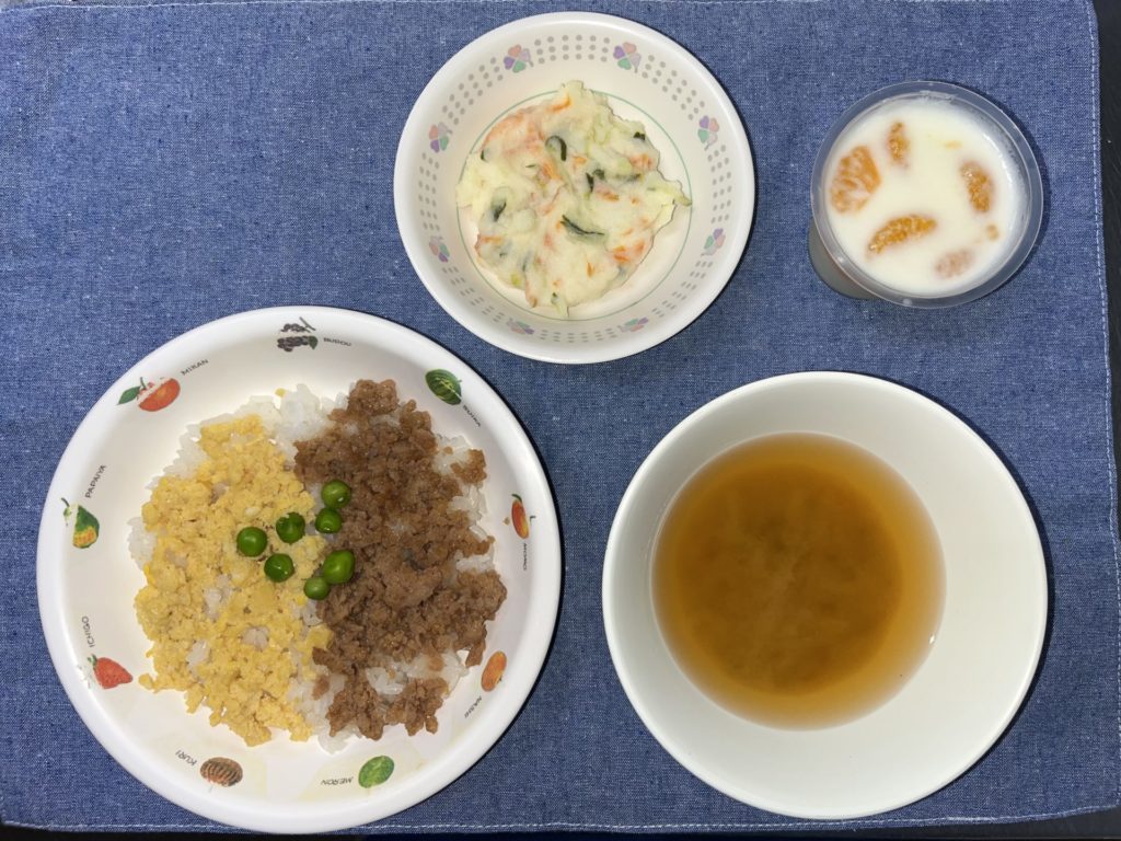 今日のお給食は、三食丼、ポテトサラダ、おみそ汁でした。