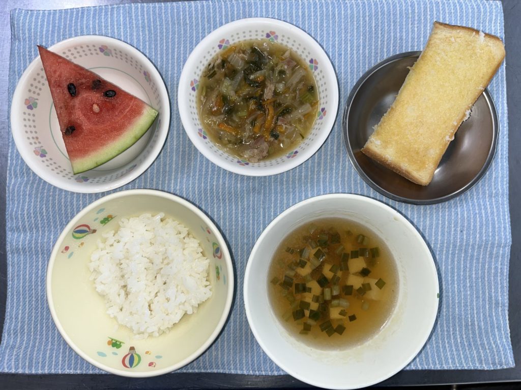 今日のお給食は、中華うま煮、ごはん、豆腐スープ、すいかでした。