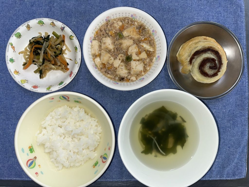 今日のお給食は、マーボー豆腐、もやしのナムル、ごはん、わかめスープでした。