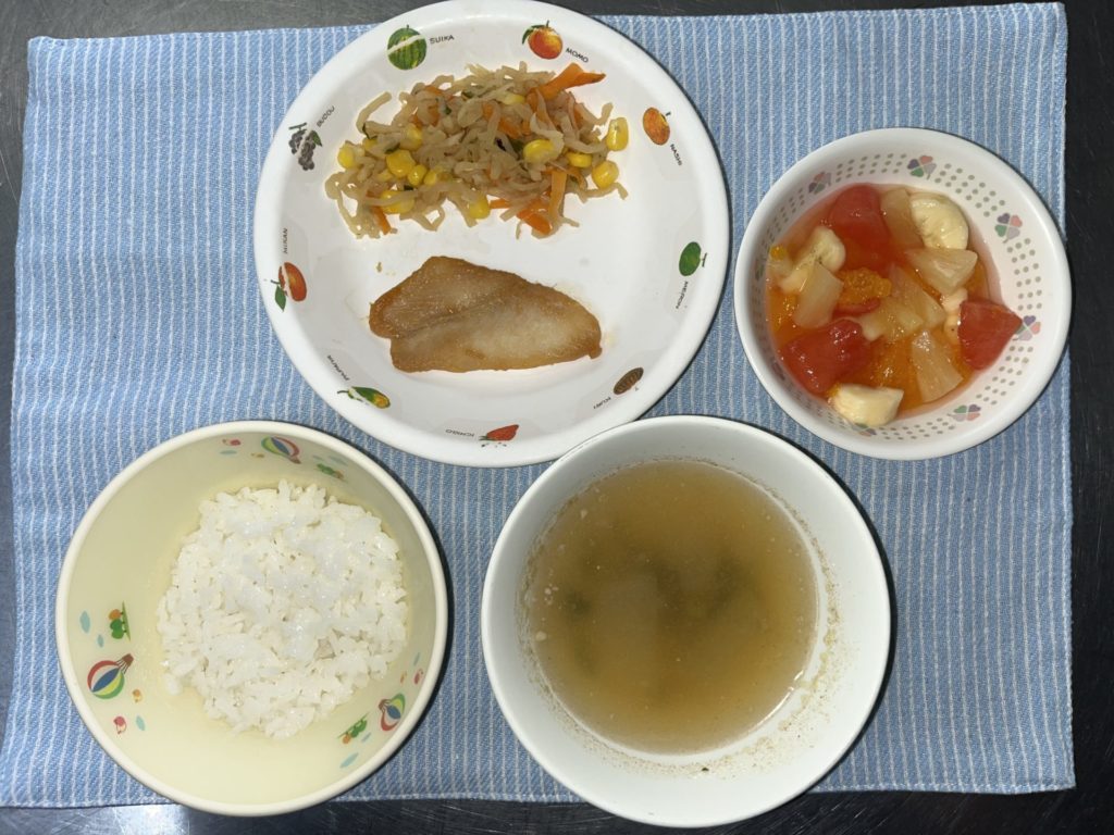 今日のお給食は、魚の味噌煮、切り干し大根サラダ、ごはん、とうがん汁でした。