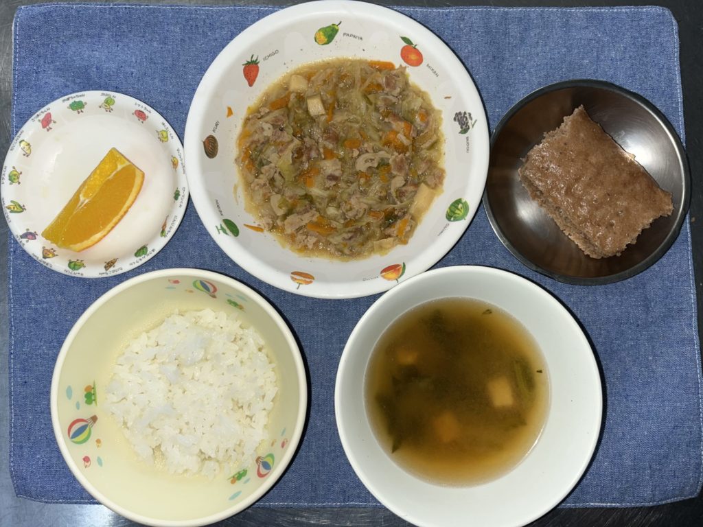今日のお給食は、豚肉とピーマンの炒め物、ごはん、おみそ汁、オレンジでした。