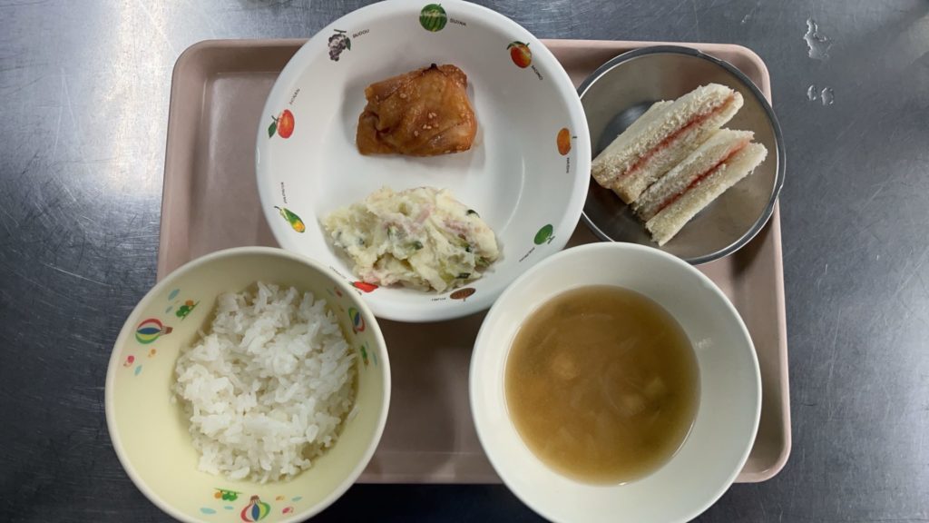 今日のお給食は、ヤンニョムチキン、ポテトサラダ、ごはん、おみそ汁でした。