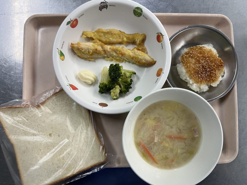 今日のお給食は、ささみのカレースティック、ブロッコリー、パン、野菜のミルクスープでした。