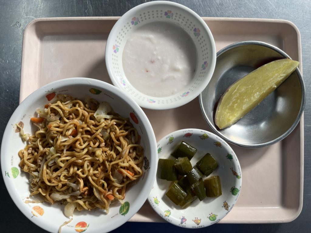 今日のお給食は、焼きそば、たたききゅうり、ストロベリーヨーグルトでした。