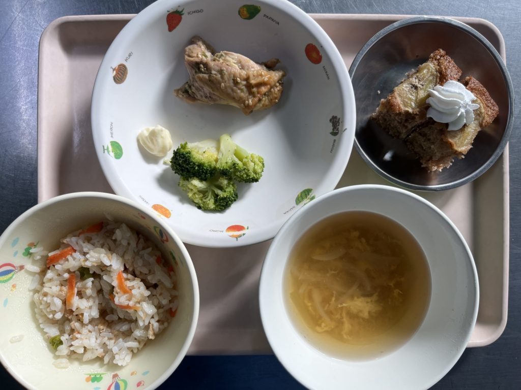 お昼は、鶏肉の香りやき、ブロッコリー、こぎつねごはん、かきたま汁でした。