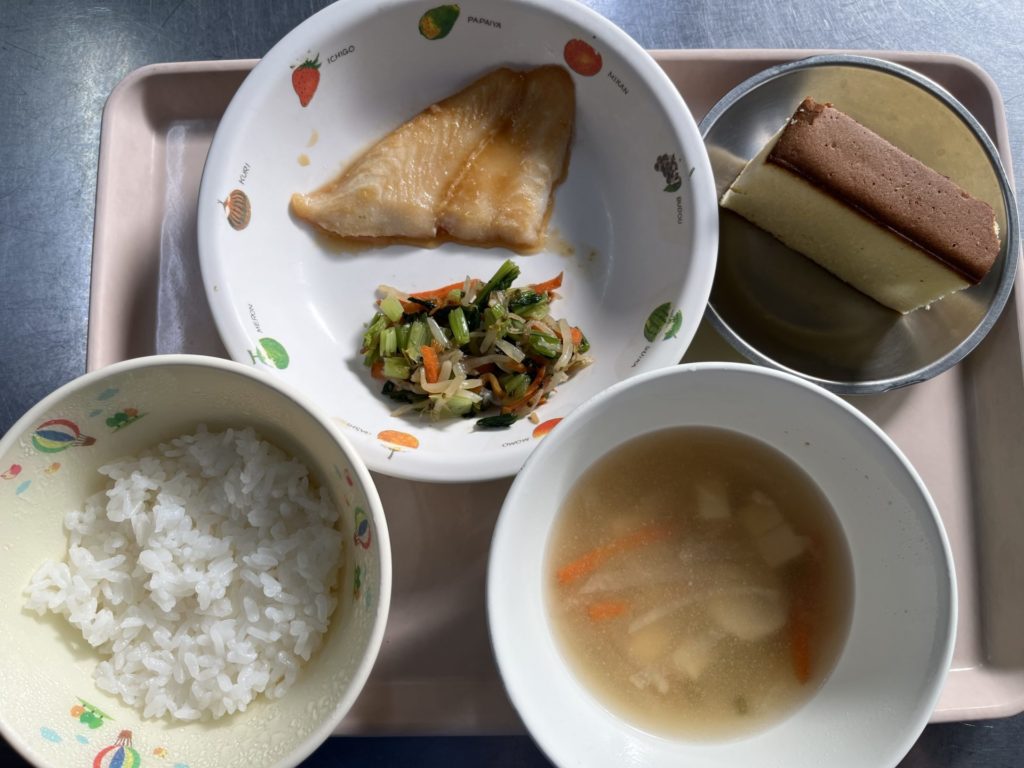 今日のお給食は、白身魚の照り焼き、青菜ともやしの磯あえ、ごはん、とん汁でした。