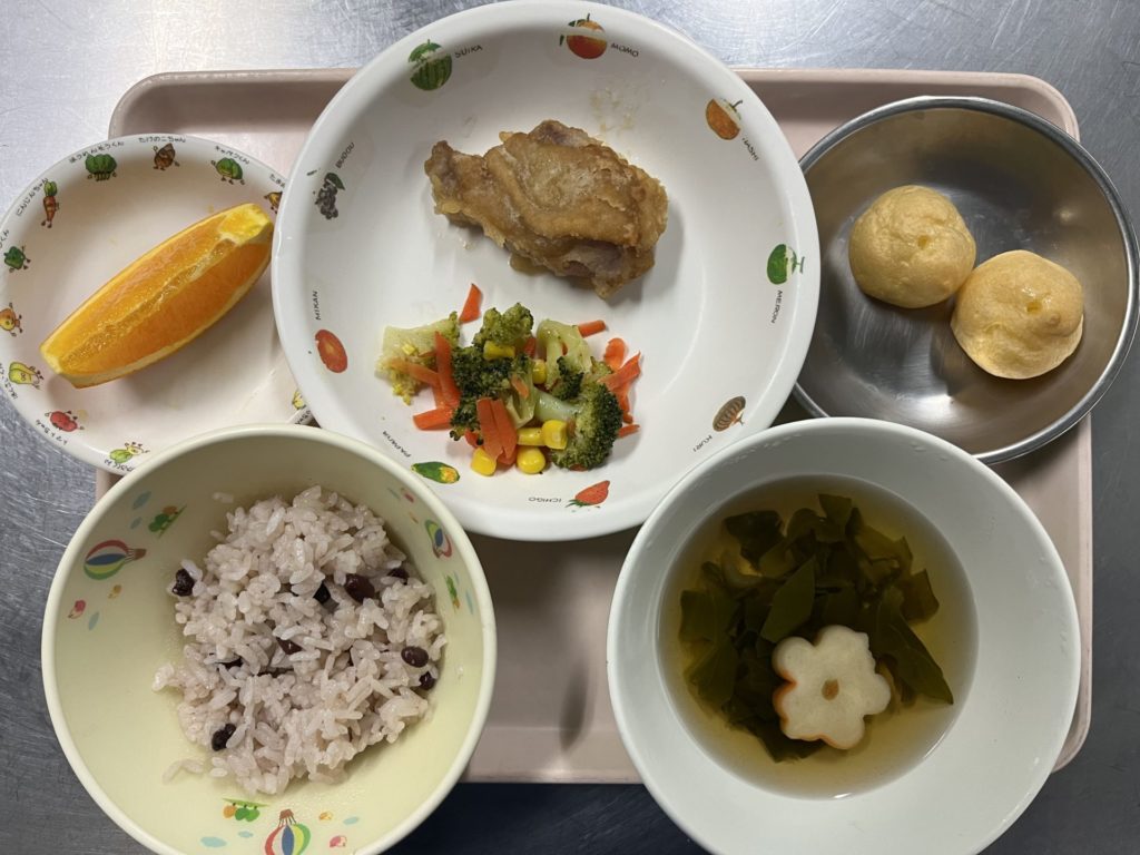 今日のお給食は、鶏のから揚げ、ブロッコリーのサラダ、お赤飯、すまし汁、オレンジでした。