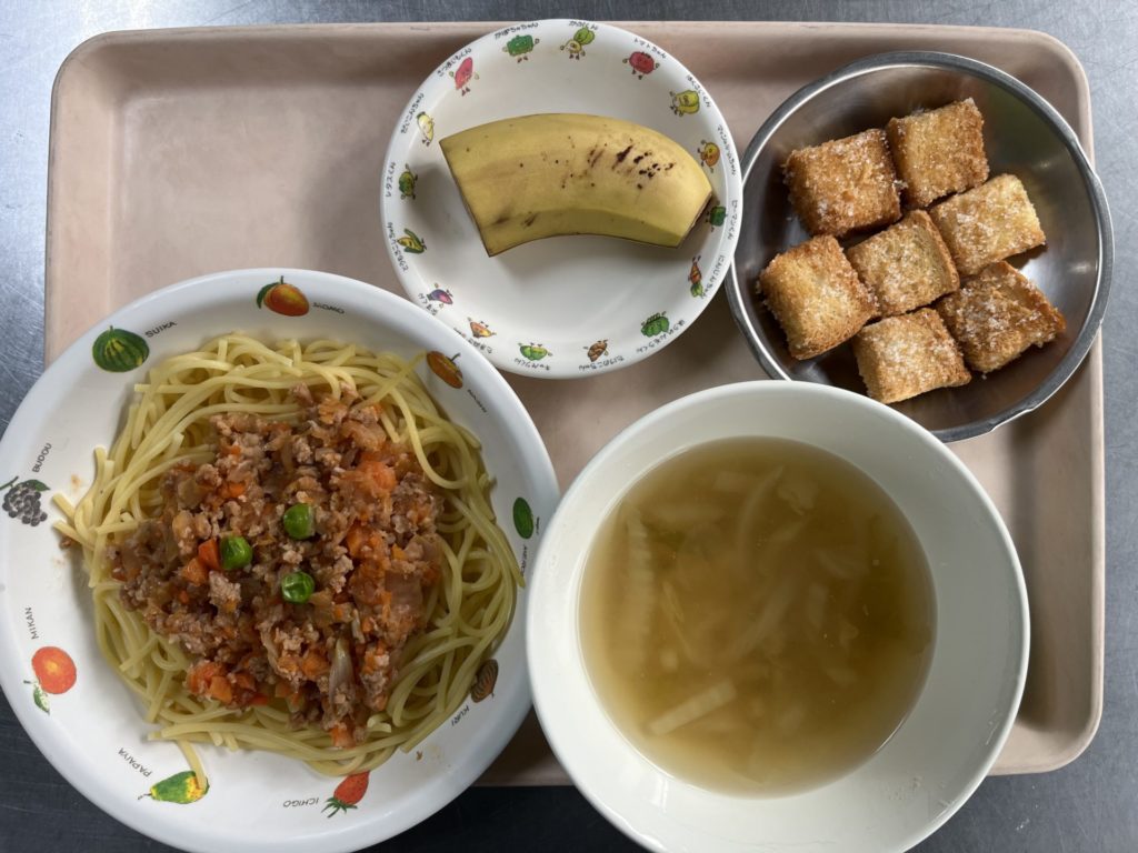 今日のお給食は、スパゲティーミートソース、白菜スープ、バナナでした。