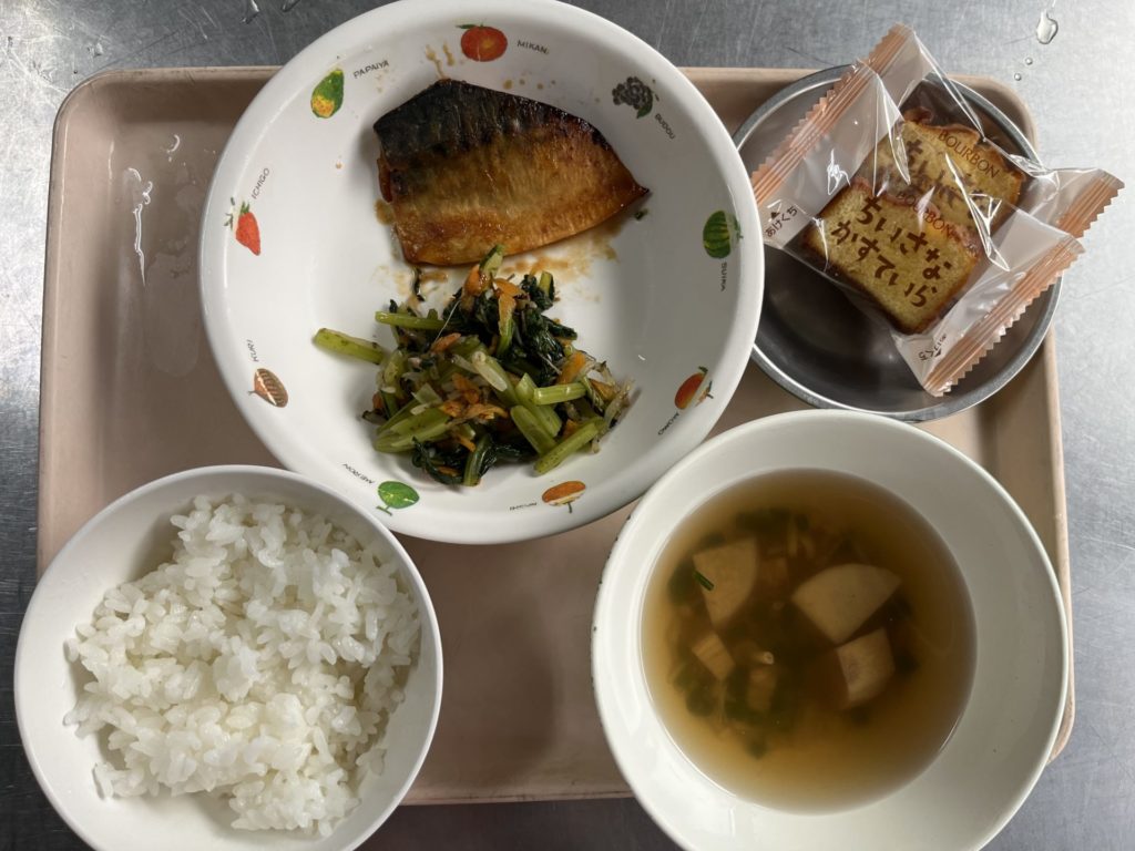 今日のお給食は、さばのみそ煮、小松菜の磯あえ、ごはん、すまし汁でした。
