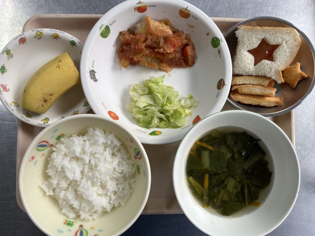 今日のお給食は、ピザ風チキン、レタス、ごはん、野菜スープ、バナナでした。