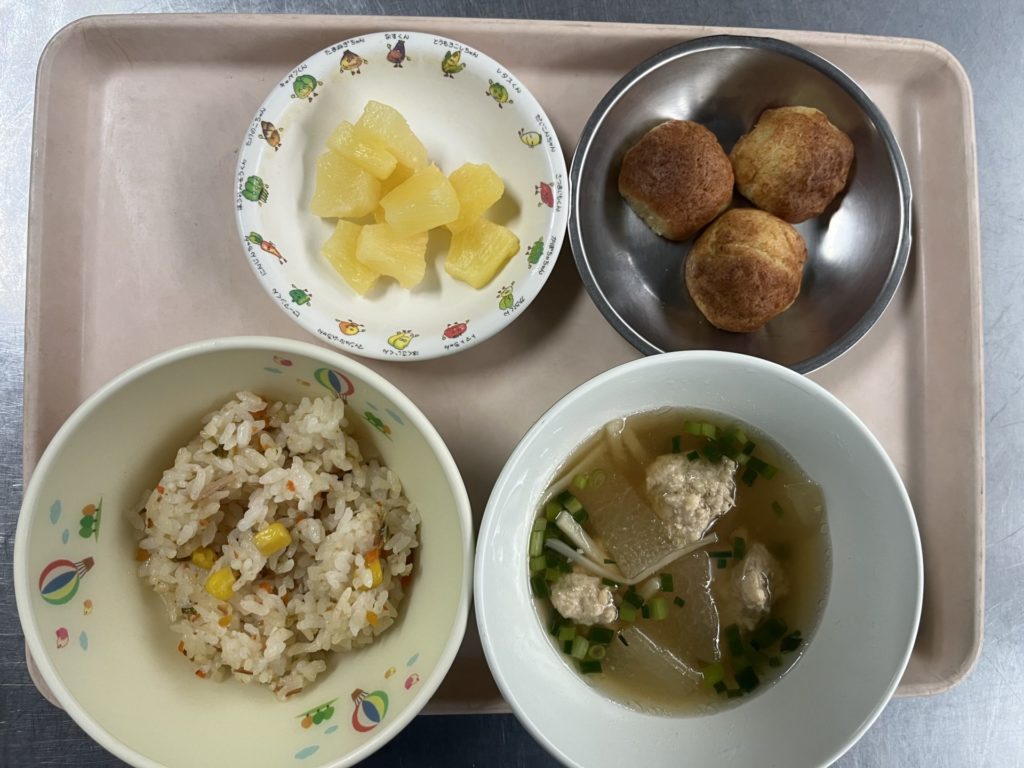 今日のお給食は、チャーハン、肉団子と冬瓜のスープ、パインでした。