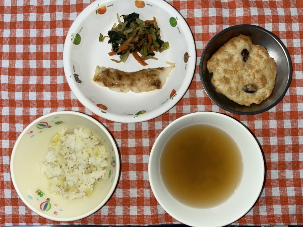 今日のお給食は、魚のみそマヨ焼き、小松菜のおかか和え、さつまいもごはん、すまし汁でした。
