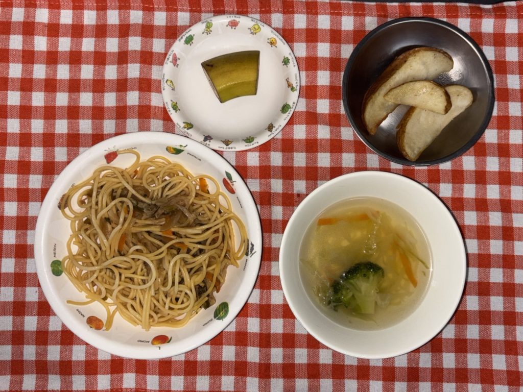 今日のお給食は、和風ツナスパゲティ、野菜スープ、バナナでした。