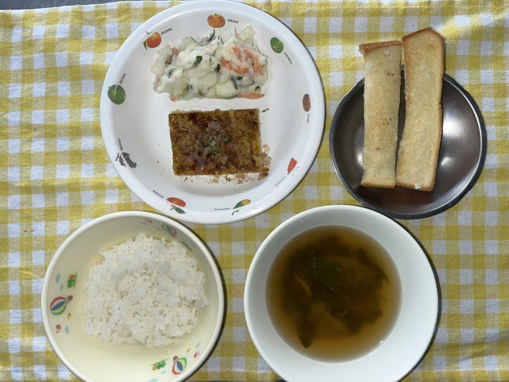 今日のお給食は、白身魚のパン粉焼き、マカロニサラダ、ごはん、おみそ汁でした。