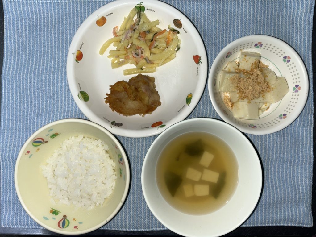 今日のお給食は、鶏肉のから揚げ、マカロニサラダ、ごはん、おみそ汁でした。