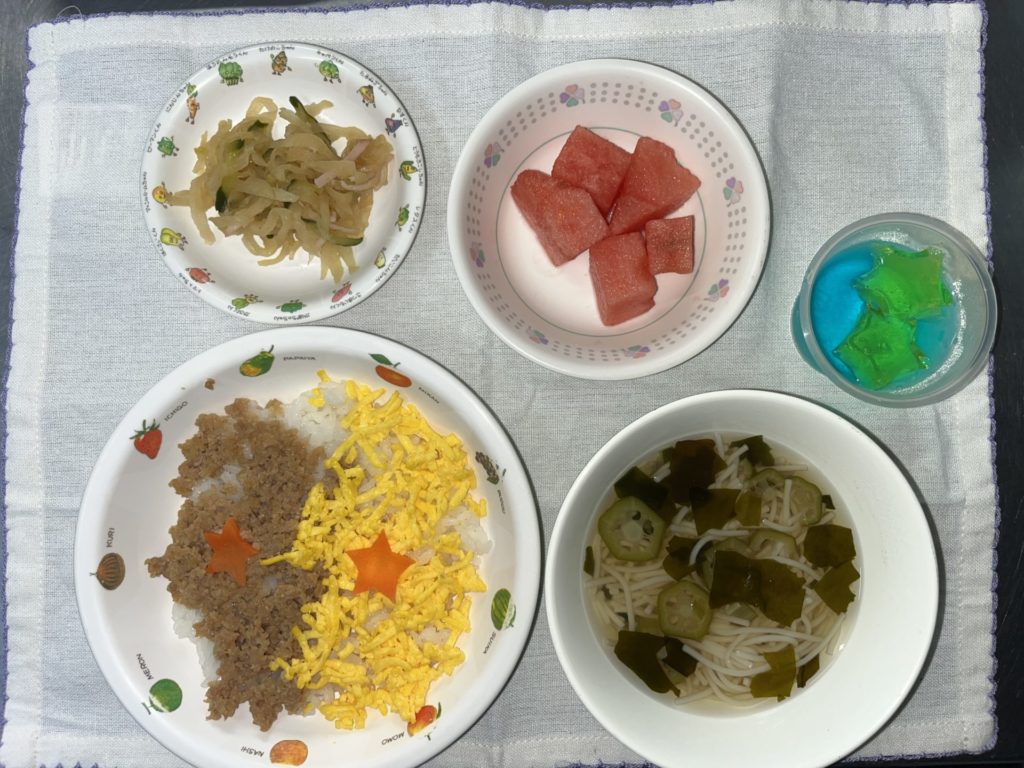 お昼は、七夕そぼろごはん、短冊サラダ、きらきらそうめん汁、すいかでした。