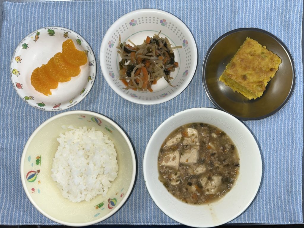 今日のお給食は、マーボー豆腐、もやしのナムル、ごはん、みかん缶でした。