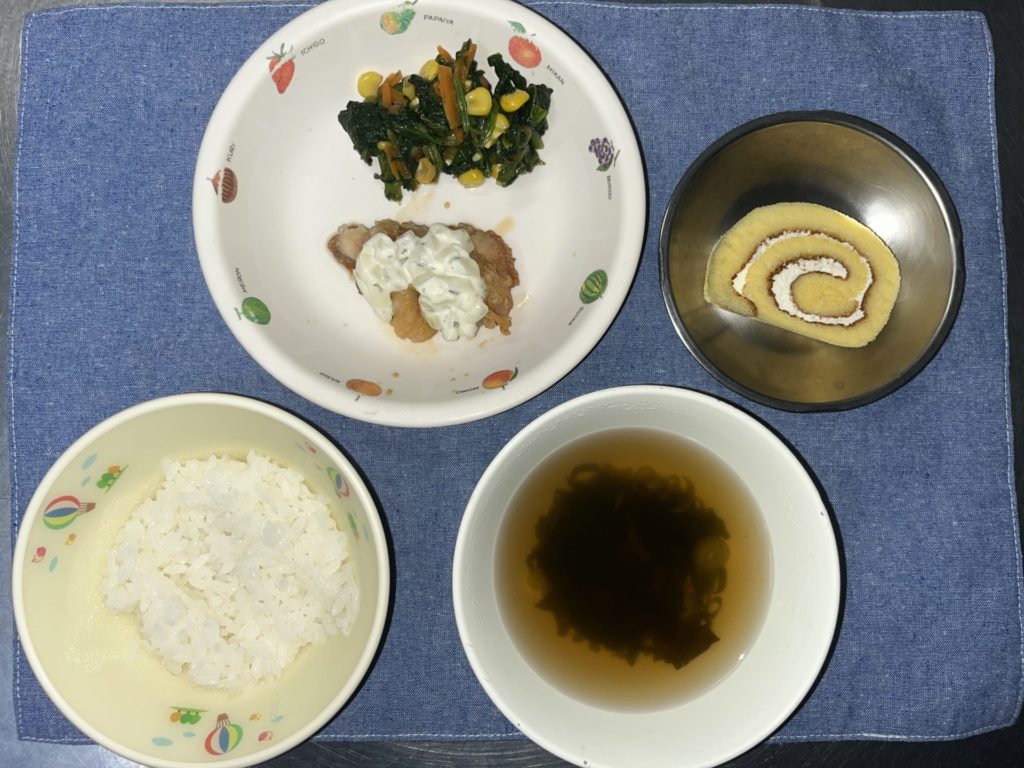 今日のお給食は、チキン南蛮、ほうれん草のおかか和え、ごはん、わかめスープでした。