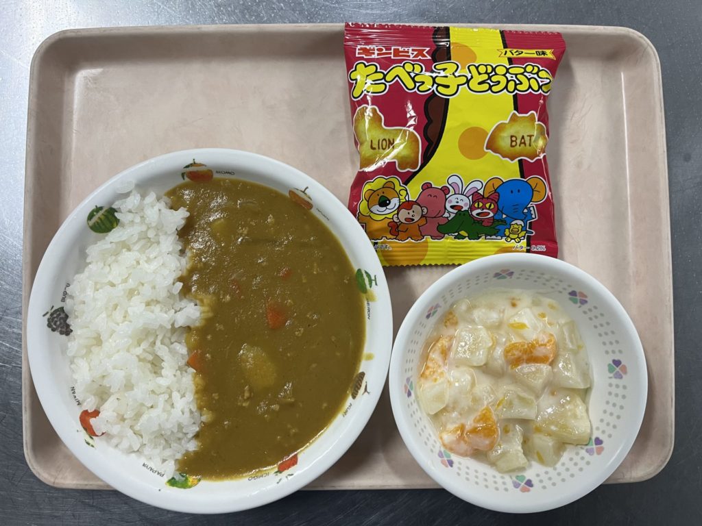 お給食は、カレーライスとフルーツヨーグルトで、おやつは、たべっこどうぶつと牛乳でした。