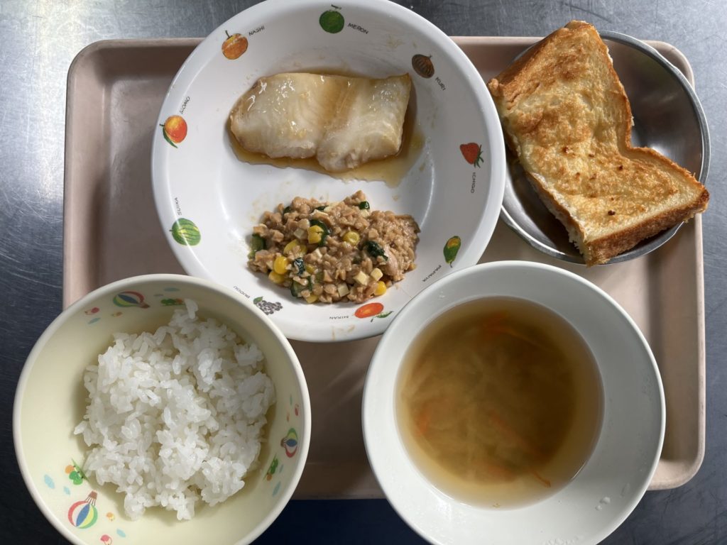 お昼は、チキンカツ、のり塩ポテト、カレーピラフ、野菜スープでした。