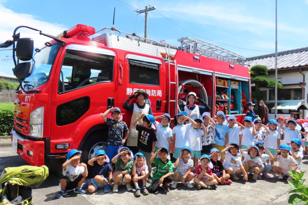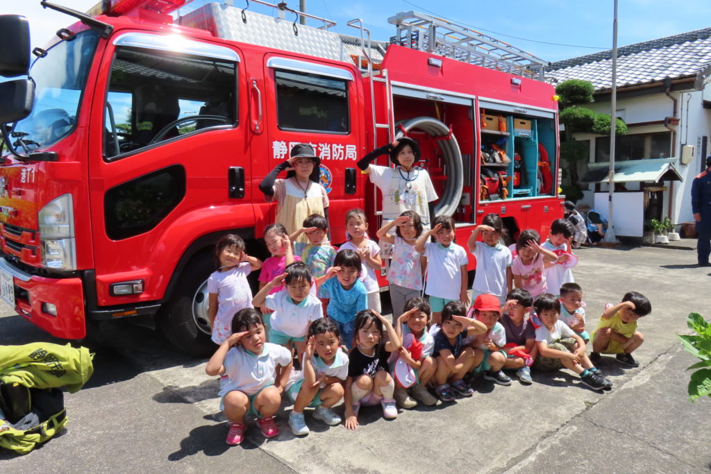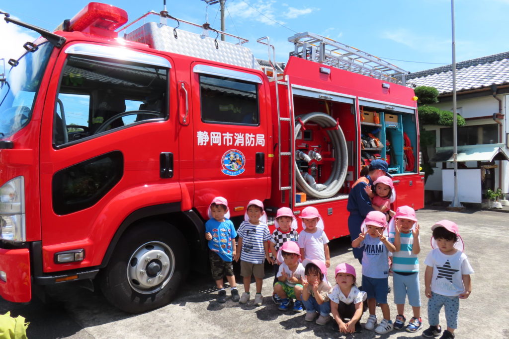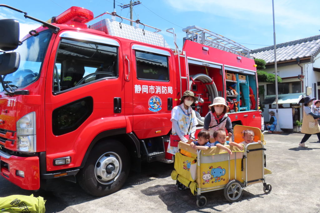また、消防車の見学もさせていただき、いつもは見れない消防車を間近でみることができて、喜んでいました。